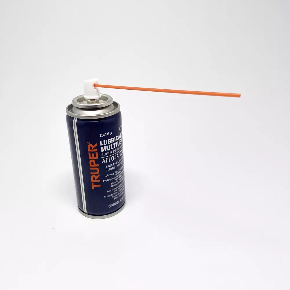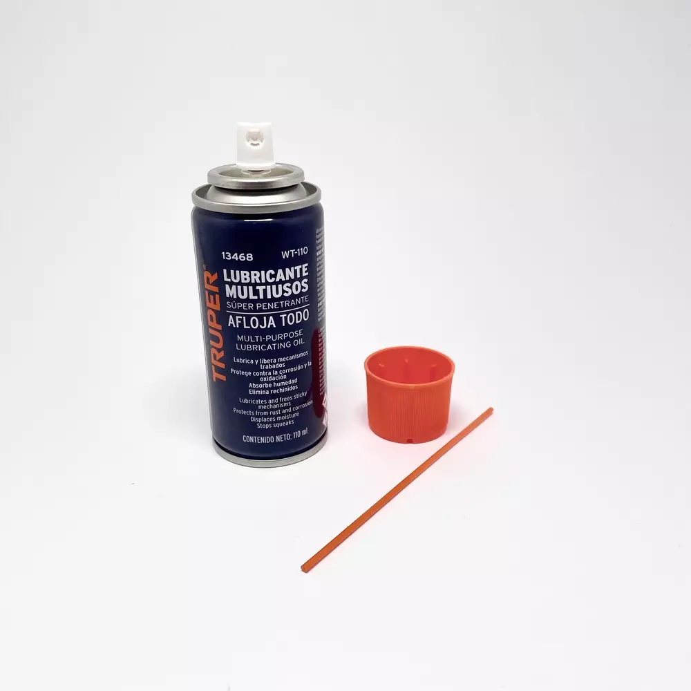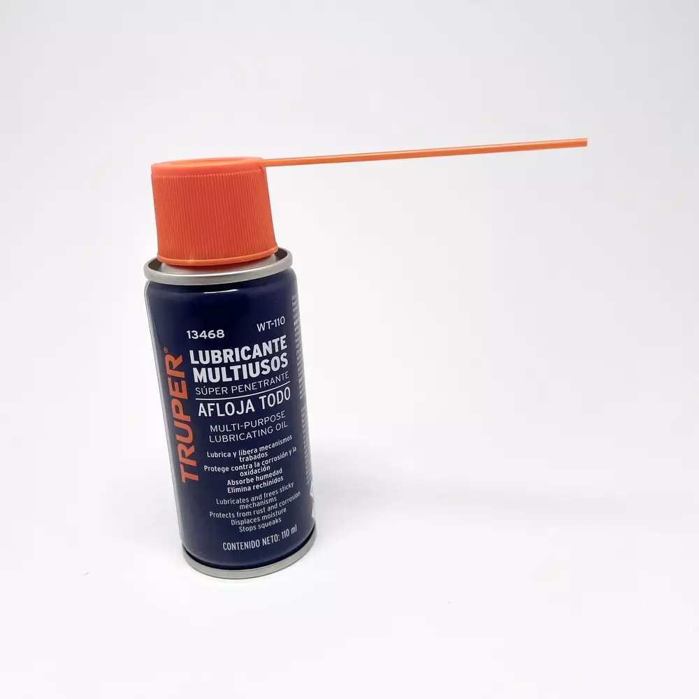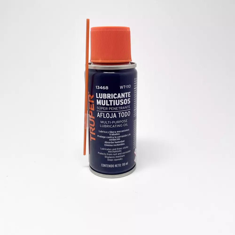 Aceite lubricante 13468 multiusos super penetrante afloja todo contenido de 110 ml lubrica y libera mecanismos trabados, protege contra la corrosión y la oxidación absorbe la humedad y elimina rechinidos aplicador en spray y tubo para lugares con difícil acceso de la marca Truper SKU 7506240653271 Modelo 1464 No.pz 1 Características del empaque cilindro metálico con capacidad de 110ml sistema de sellado de apriete con tapa plástica Garantía 1 mes en defectos de fabricación.