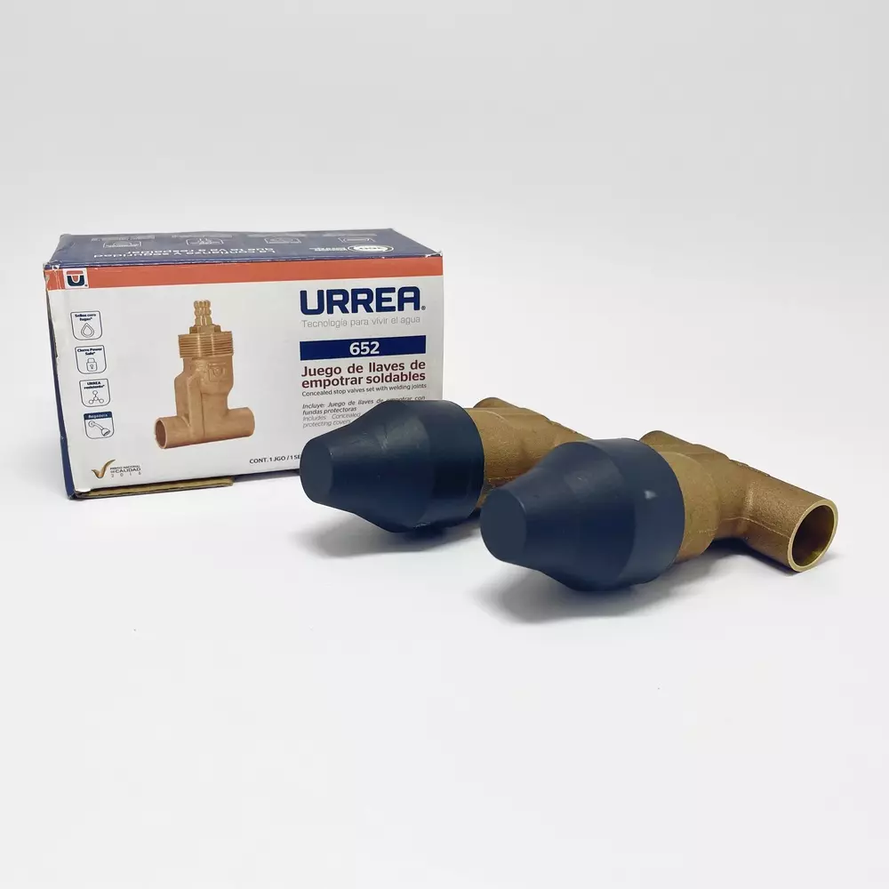 Juego de llaves para empotrar 652 soldables 1/2" 13mm sin manerales para regadera con cuerpo de bronce vástago de 360° fabricado en bronce con sistema ascendente empaque de vinilo refaccionable de fácil instalación acabado semi brillante de la marca Urrea, SKU (7501973776525) Modelo 1171 No.pz 1 Características del empaque ancho 7cm largo 10.5cm alto 6cm fabricado en cartón Garantia 10 años acabados en cromo 2 años en otros acabados.