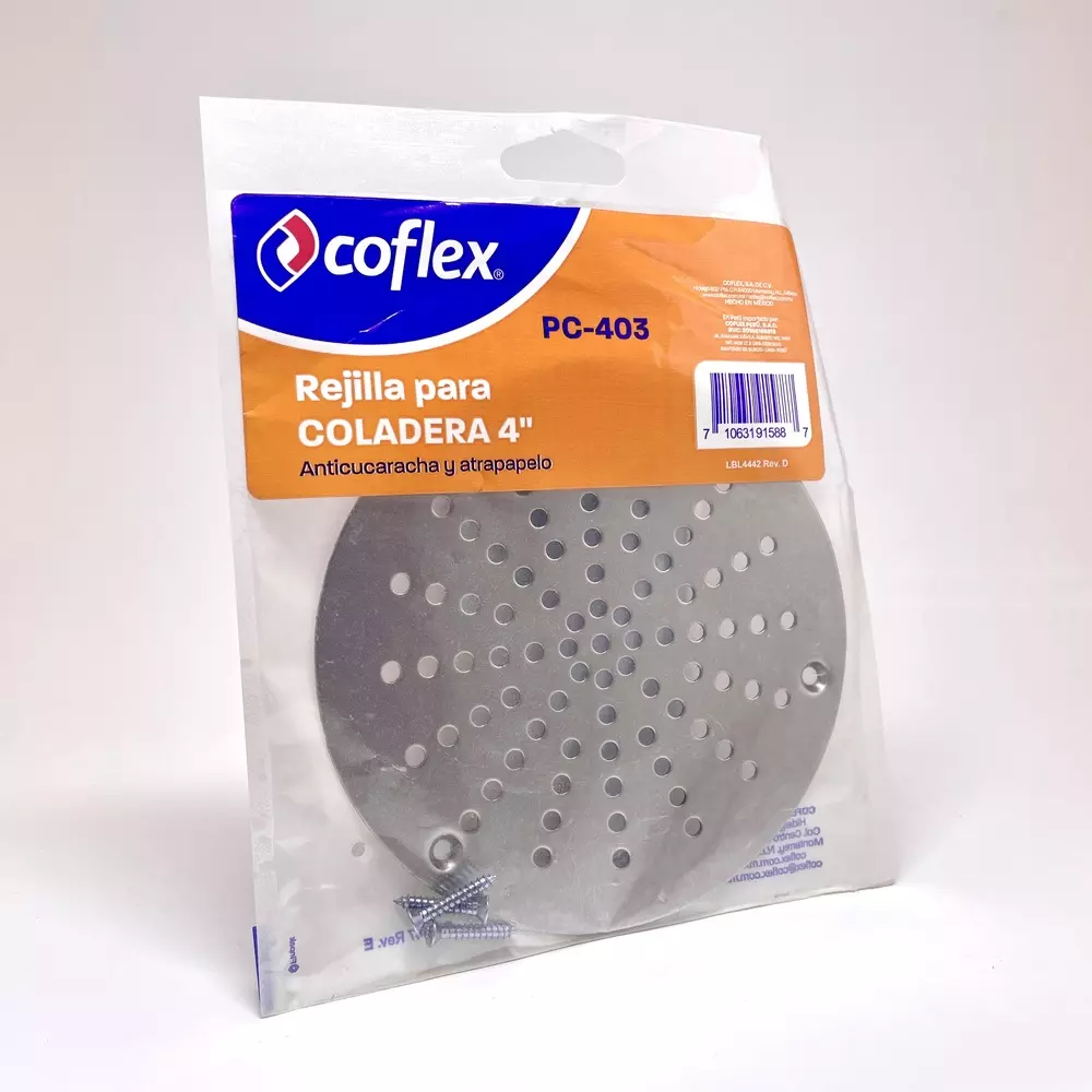 Rejilla anti-cucarachas y atrapa pelo para coladeras PC-403 de 4 diámetro de 12.9cm fabricada en acero inoxidable calibre 18 con tornillos en acero inoxidable de la marca Coflex, SKU (710631915887), Modelo 2964, No. pz 1 Características del empaque blister transparente ancho 14cm largo 18cm, Contenido por caja 25pz dimensiones ancho 13cm largo 23cm alto 21cm, Garantía 1 año.